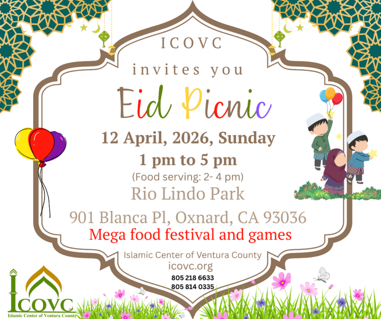 Home Welcome To Islamic Center Of Ventura County Our vision is to inspire our current and future generations to build a continuous relationship with Allah (God) by maintaining an environment of constant remembrance of Him and applying the values of the prophetic model. View More Click to watch the Picnic video Download ICOVC app to your phone Prayer time MONTH CALENDER AprilDOWNLOAD View For All Year Masjid Iqaama Time view our construction project Donate via Zelle icovcoxnard@gmail.com